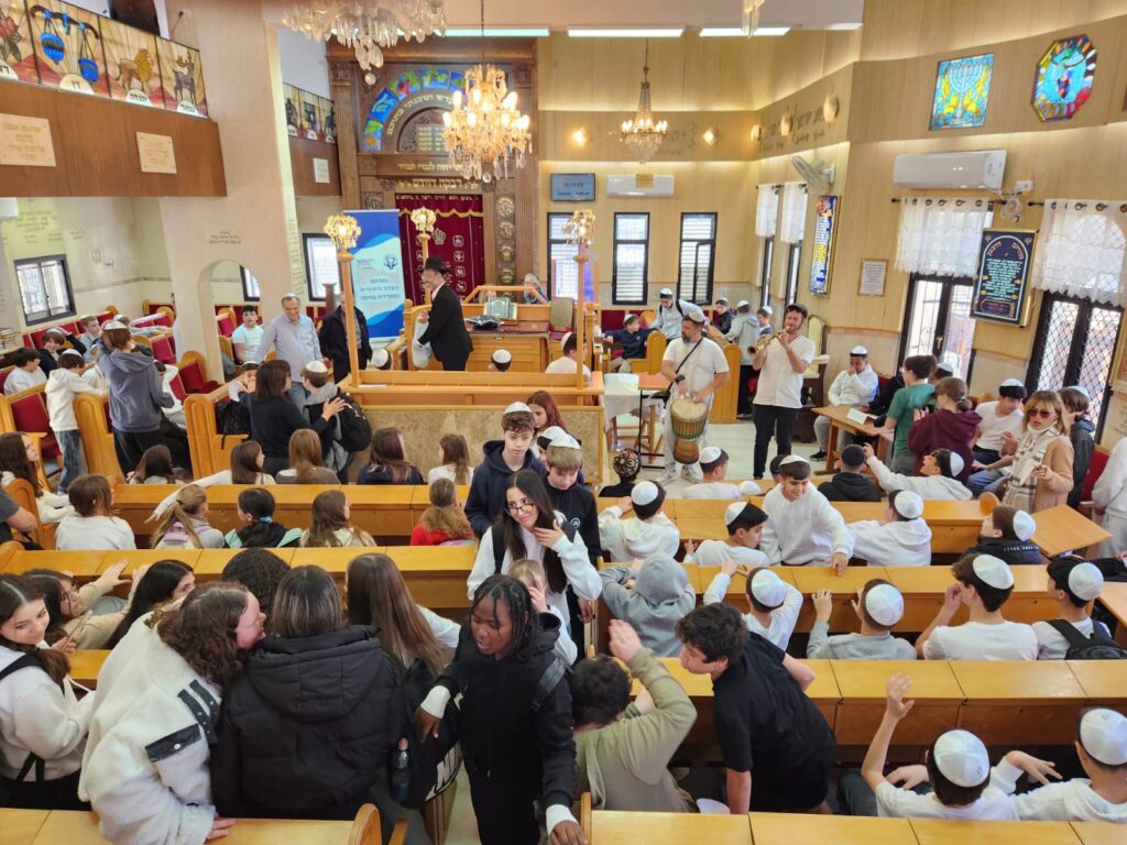 כ-150 נערות ונערים נרגשים התקבלו ברחבה שליד בית הכנסת בתופים ושופרות. גם הטקס עצמו כלל שירים וריקודים כדי להבליט את יסוד השמחה בכל בר מצווה ובת מצווה.